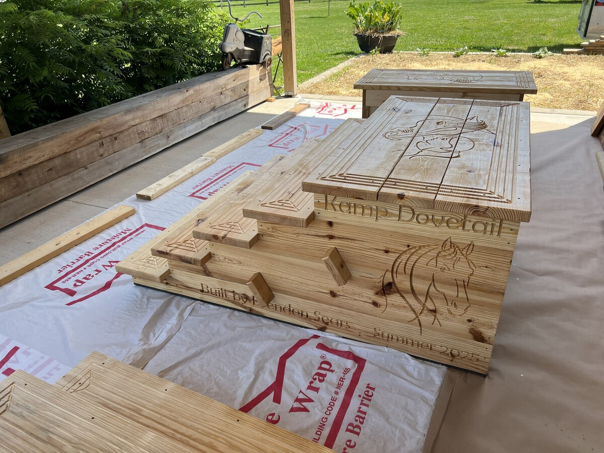 My son Brendon and I designed, built and donated these to the program. They are coated with three coats of sealer and will always be stored inside of a barn. Expected life is 100 years. We made them with personal statements carved into them so they would likely not be stolen again.